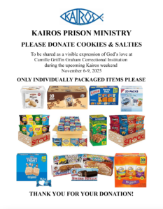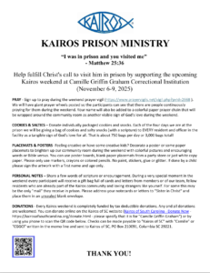 by supporting the upcoming Kairos weekend at Camille Griffin Graham Correctional Institution, November 6-9.